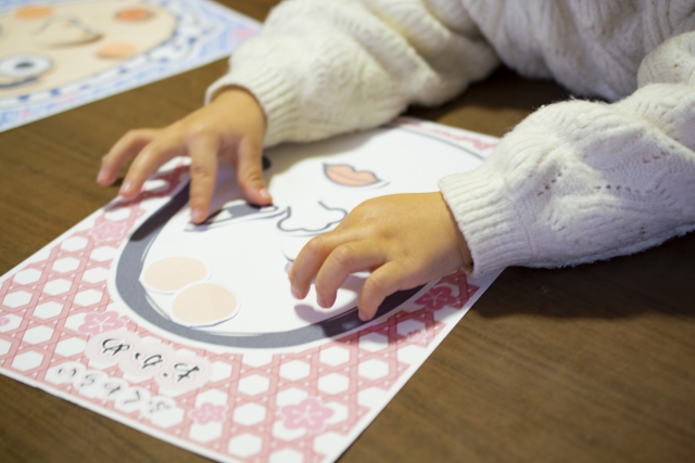 大人は「目隠しをする福笑い」で思いっきり変な顔を作って一緒に笑いましょう。特性を持つ子どもたちは、失敗が多く、失敗に対して弱いことがあります。そのため、大人が先に失敗して「でも楽しかった」「次も頑張ろう」といった行動を見せることが、子どもの「失敗しても大丈夫なんだ!」という学びに繋がります。